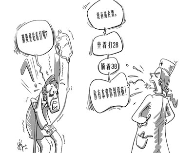 一患者在西安市第一医院打针时,因不满站着打针还要收费(坐着输液28元,躺着38元),与护士理论,护士称“你有本事别得病”。(西部网3月3日)漫画:徐简