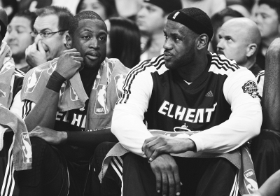 3月7日,热火队球员韦德(左)和詹姆斯在替补席上表情严峻。