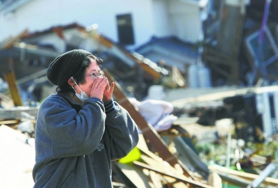 3月14日,在日本宫城县相马,一名妇女在废墟中呼喊家人的名字。