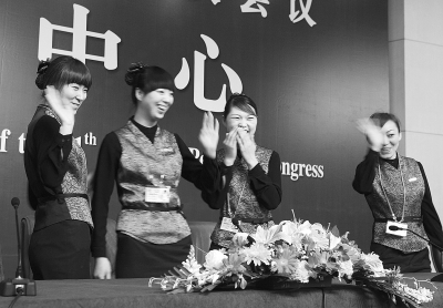 3月13日,全国“两会”新闻中心最后一场新闻发布会结束后,工作人员模拟发言人在主席台挥手拍照留念。本报记者 郑萍萍摄