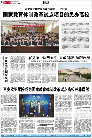 陕西省教育厅领导在出席西安欧亚学院国家教育体制改革试点项目启动仪式上做了重要讲话。指出:“陕西省贯彻落实国家教育规划纲要的《实施意见》突出强调了支持、做强民办教育,也对民办高等教育发展寄予厚望,其中包括欧亚学院。陕西民办高等教育能够蓬勃发展,也面临着许多新的困难和挑战,解决这些困难要靠改革和创新,靠敢作敢为,方能创出了一条新路子。在生源减少的趋势下,民办高等教育正处在深度洗牌的阶段,还有尚未完成原始积累的学校面临更高的发展成本和更严峻的挑战,而跻身于平稳常态发展的一批学校,则在办学理念、教学改革、内涵建设、特色发展等方面展开了新一轮的竞争。”