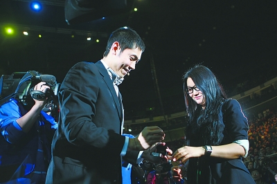 3月20日,北京五棵松篮球馆,在CBA全明星正赛开赛前,北方明星队张庆鹏在现场观众的注视下向未婚妻求婚。
