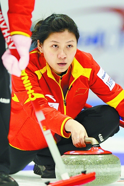 当地时间3月19日,在丹麦举行的2011女子冰壶世锦赛首轮较量中,中国队以6∶8不敌加拿大队。图为中国选手柳荫在比赛中。