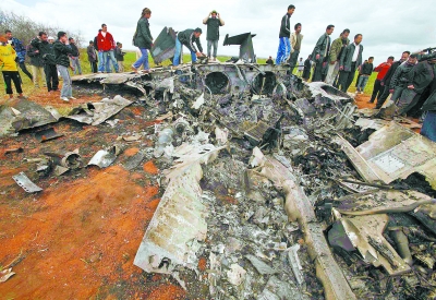 3月22日,在利比亚班加西附近,当地居民查看一架坠毁的美国战机。