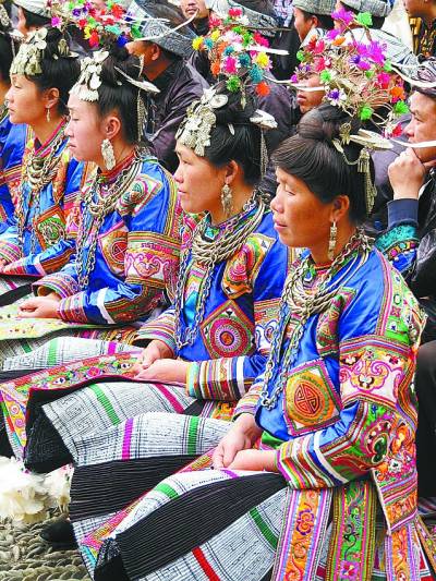 苗族妇女盛装的制作很费工夫,一套衣裙的制作需要几年的时间,特别是挑花、绣花盛装,全套配齐往往要七八年。一个苗族女孩出生后,她的母亲就会为她绣一套盛装,这套衣服只有在重大的节日或者出嫁的时候才穿。而苗家女子到了老年之时则会把自己的衣服传给小辈,或是将衣服上的银饰拆下来送给小辈。就是这样一代代的飞针走线,传承了苗族独特的服饰文化和历史。