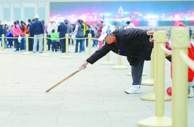 10月19日,北京天安门广场,刘玉珍干起活儿来十分认真,围挡内的垃圾她经常够着身子也要尽力将其拾起。刘玉珍今年已75岁,从1994年至今,她坚持每天来广场义务清理各类垃圾。17年来,无论刮风、下雨、沙尘暴,她几乎从不“缺勤”,捡的垃圾累计上百吨。广场上的执勤警卫、环卫工人都亲切地称她为天安门广场的义务“美容师”。