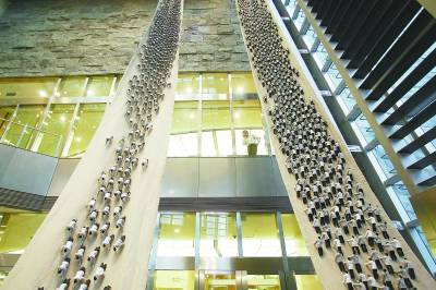 10月24日,上海环球金融中心内,正在展示艺术家计文于的作品《上山·下山》。悬挂的两条巨型条幅上“插”满了小布人,远看就是此起彼伏、汹涌澎湃的“人潮”,用以演绎上班族的奔波生活。