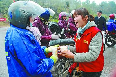 春节来临之际,团广西玉林市委携手玉林市消防支队等单位在玉林324国道秀水收费站出口设立“让温暖一起回家”服务点,免费为骑摩托车返乡的农民工提供瘦肉粥、姜糖水、方便面等食品,并向其开展消防知识宣传,提供招工信息服务,让奔波劳累的“铁骑大军”得到休息放松后再上路。本报记者 谢洋摄