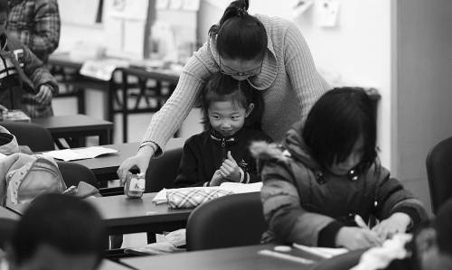 12月10日,在北京安慧里社区为进京务工人员子女筹办的“三好学堂”上,社工“老师”在给一名女学生检查作业。