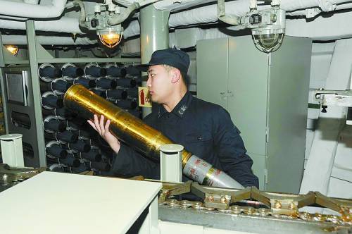 舰员们在清扫甲板 本报记者 赵飞鹏摄