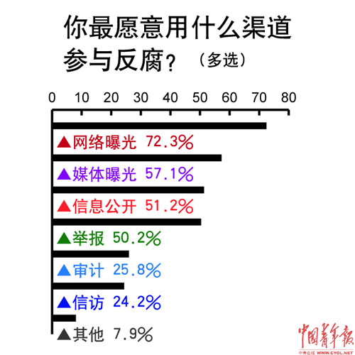 本报讯(记者王聪聪)3月5日至3月10日,中国青年报社调中心通过题客调查网进行的调查显示,77%的人期待有关方面能提供更多便于老百姓参与反腐败的渠道。当前公众愿意参与反腐的渠道包括:网络曝光(72.3%)、媒体曝光(57.1%)、信息公开(51.2%)、举报(50.2%)、审计(25.8%)、信访(24.2%)等。全国31个省(自治区、直辖市)8079人参与调查,14~45岁年龄段占89.5%。