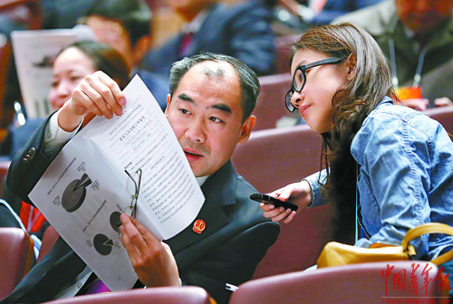 3月10日,人民大会堂,一名列席人大会议的法官正在向记者解读最高人民法院工作报告。