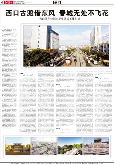 滴滴辛勤的汗水,浇灌出亭亭玉立的县城。气贯长虹的长城、黄河大街犹如两条并行腾飞的巨龙;亮丽的通幽小巷、社区便道,随处可见的是绿树婆娑、芳草茵茵,与这洁净、宽阔相伴的是河曲人民喜上眉梢的欢愉和随处可闻的创卫之歌的悦耳。花团锦簇、景色宜人、气象万千,这是美丽的县城,这是发展的河曲。古老而又年轻的西口大地,正在成为美丽的花园、舒适的家园、文明的乐园。