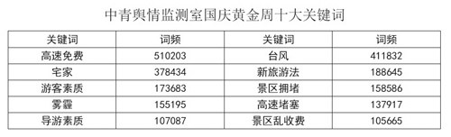 中青舆情监测室根据一定算法,结合舆情传播特征,综合得出了国庆黄金周内50个热点公共事件。在这50个事件的舆情中,“高速免费”出现的词频高达510203次。