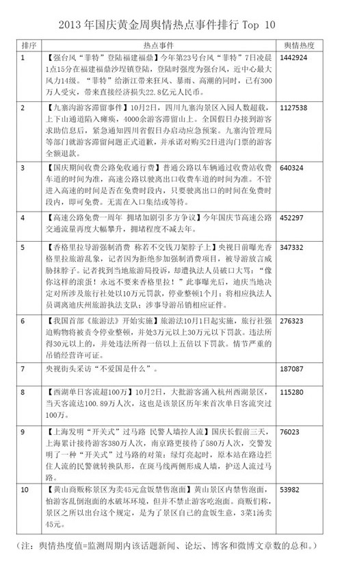 “黄金周”中引发热点公共事件最多的是四川省,达到7起,平均下来是“一天一热点”。而在十大热点事件排行榜上高居“榜眼”的,就是该省著名旅游胜地九寨沟的交通瘫痪事件,第一名为我国东南部的强台风灾害。