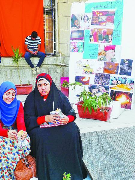 开罗大学经济与政治学院门前10月9日竖起反对军政当局的宣传海报。