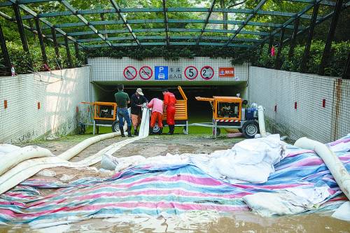 10月9日,上海市江桥镇城市岸泊小区,工作人员在被淹车库的入口进行排水。10月8日凌晨,暴雨导致城市岸泊小区的4个车库受灾,车库入口被完全淹没,69辆车被淹。
