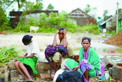印度洋北部强旋风“费林”12日晚登陆印度东部海岸,约50万人被迫转移。“费林”12日晚21时左右在印度东部奥里萨邦高帕尔普尔登陆,平均风速超过每小时200公里,风力达17级,在该邦引发大面积强降雨。印度气象局当天发布了“红色”风暴预警。图为印度桑普镇一家居民13日在等待转移。新华社/法新