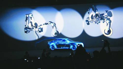 发动机、变速箱、油箱……一个个零部件被屏幕上“伸出”的大手逐一“抛”进地面上的汽车骨架里。在投影仪的映射下,蒙着白布的B50完整地展示了自己由一块钢铁到一辆汽车的变形记。