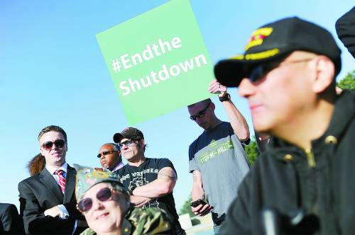 美国退伍军人15日在首都华盛顿二战纪念碑前举行集会,抗议已持续两星期的政府关门。新华社记者 张军摄