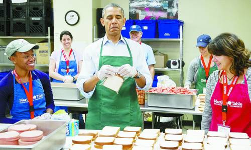 美国总统奥巴马14日在华盛顿食品慈善机构“马大的餐桌”当众制作三明治。新华社/法新