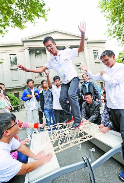 10月17日,一名体重近70公斤的学生站在用50根细木条制作的一组桥梁结构模型上,展示模型的承重能力。