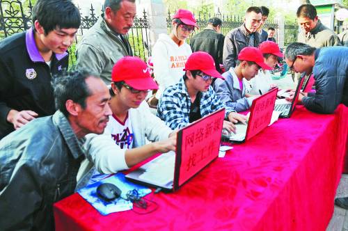 当日,山东聊城大学化学化工学院的8名大学生志愿者来到聊城市花园路劳务用工市场,开展“网络新媒找工作、志愿服务我先行”帮农民工网上求职活动。志愿者现场采集求职农民工的个人资料和求职信息,帮助农民工在网上发布,并帮他们建立手机微博,发动朋友转发,以便让更多用人单位发现这些求职者,让他们获得更多就业机会。