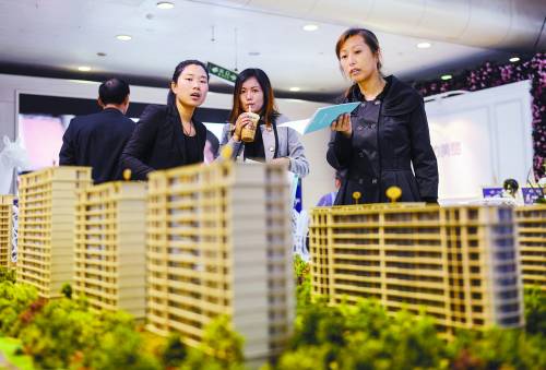 10月18日,杭州,几名购房者在房博会上一个参展楼盘前观看。