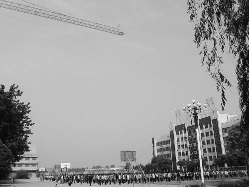 照片中,学生们在操场上集合准备做课间操,在空中,一节塔吊臂伸进了校园,就在学生头顶之上。