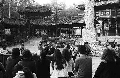 11月18日,旅游专家正在贵州苗王城旅游风景区为从业者授课。近日,首届武陵山旅游论坛在湖南怀化和贵州铜仁两市举行,论坛邀请国内知名旅游策划人和创新营销专家参与,旨在通过论坛打造新一轮“大武陵山”旅游业态,提高武陵山景区各单位的接待服务水平,促进无障碍旅游发展,并利用旅游资源承载该地区扶贫工作。武陵山属云贵高原云雾山的东延部分,绵延渝鄂湘黔4省,目前区域内已拥有张家界、凤凰古城、梵净山等多个著名景点。