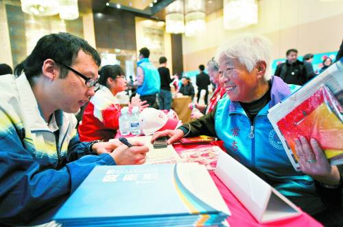 12月5日,北京市北辰洲际酒店,北京志愿者常志复(前右)在2013中国志愿服务国际交流大会上与首都无偿献血志愿者协会的志愿者交谈。