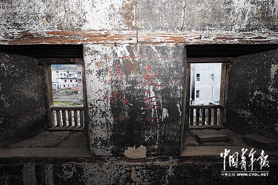 我们在福兴楼里信步之时,黄昏将至,穿过窄小深厚的窗口,阳光蹑手蹑脚地爬过沉睡的楼板,铺成一道与周围湿暗空间截然不同的柔美光柱。透过光柱,关于“阶级斗争”的口号依稀可辨,这与土楼外墙关于“计划生育”的红字标语,一起组成了关于两个时代的记号。