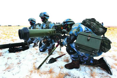 图为海军陆战队员在雪地里进行反坦克火箭操作使用训练。