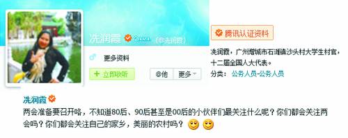 本报北京2月27日电(记者李玥)“我是一名新代表,也是一名80后,在两会上,我希望发出青年人的声音。”2月25日晚,全国人大代表冼润霞在自己的腾讯微博中向青年人喊话:“两会准备要召开咯,不知道80后、90后甚至是00后的小伙伴们最关注什么呢?”