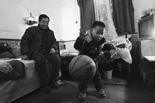 2月25日,在河南省焦作市温县城区一所小学附近,70岁的“陪读外公”职成祥在出租屋陪外孙李星辰玩耍。李星辰今年7岁,上一年级,母亲去世,外公租一间房陪读,每年房租1700元。CFP供图