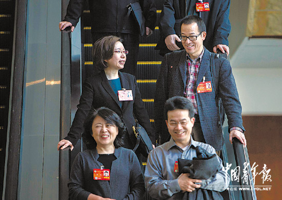 3月9日,北京国际饭店,全国政协委员、北京师范大学原校长、中国教育学会会长钟秉林在通往会场的电梯上紧了紧领带(图一);全国政协委员、中国疾控中心主任王宇(前右)和卫计委副主任孙志刚在电梯上谈笑(图二); 全国政协委员、新东方教育集团董事长兼CEO俞敏洪(中右)和全国政协委员、中央音乐学院教授刘月宁在电梯上交谈(图三);全国政协委员、复旦大学教授葛剑雄(右)和全国政协委员、首都师范大学文学院院长左东岭一路攀谈下了电梯(图四)。