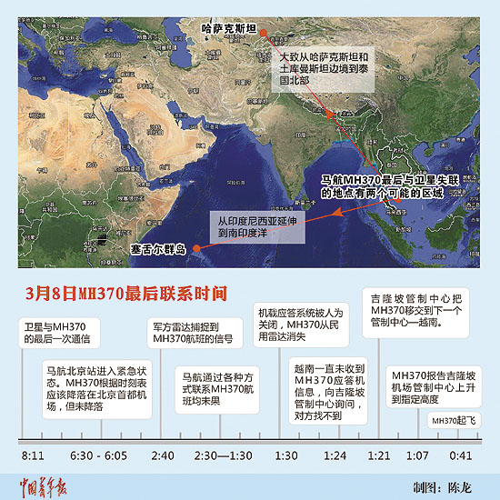 纳吉布说,马来西亚民航当局和相关的国际专家确认飞机最后与卫星失去联系的地点有两个可能的区域:一是大致从哈萨克斯坦和土库曼斯坦边境到泰国北部,二是从印度尼西亚延伸到南印度洋。他说,“我们现在结束在南海的搜寻,重新评估和部署我们的搜救力量。”