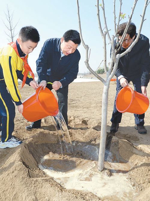 习近平一下车,就拿起铁锹径直走向植树地点同北京市、国家林业局的负责同志和少先队员开始植树。总书记来到一棵白皮松旁,挥锹铲土填入树坑中,随后培实新土、堆起围堰,道道工序做得认真细致。碧桃、元宝枫、榆叶梅、丁香、西府海棠……习近平接连种下6棵树苗,每种一棵,他都同少先队员一起提水浇灌,并勉励他们努力做到德智体美全面发展,在努力学习的同时,树立劳动观念、劳动意识、劳动习惯,热爱劳动,强健体魄,长大以后通过辛勤劳动为建设祖国贡献力量。