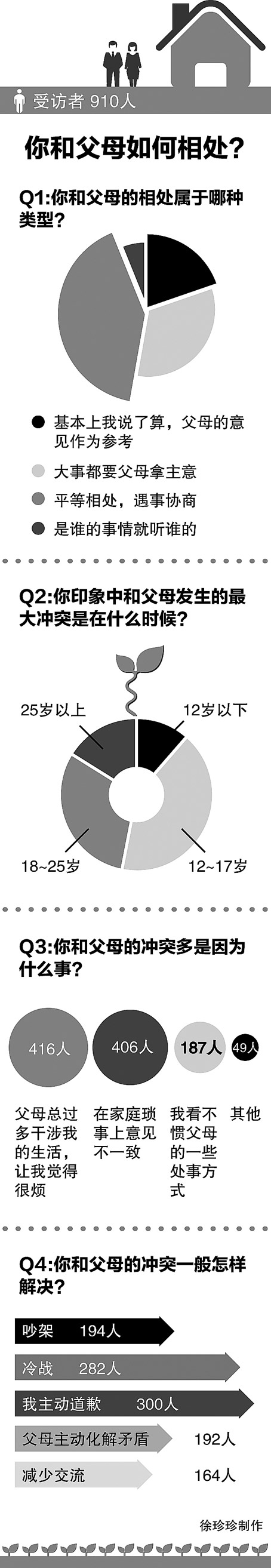 《中国青年报》青春热线与中青在线、问卷网联合推出的调查显示,超过70%的受访者与父母发生最大冲突的年龄段,主要集中在12到25岁之间,也就是从中学阶段开始,一直持续到初入职场。90%的受访者表示,与父母发生冲突的焦点事件,主要体现在父母总是过多地干涉自己的生活,以及在家庭琐事上意见不一致。尽管有40%的受访者与父母能够平等相处,遇事协商,也有33%的受访者表示,大事都要父母拿主意。