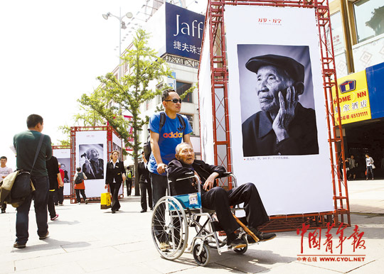“五一”期间,一场摄影展览在北京王府井步行街举行。该展览通过百余位海南省万宁县百岁老人的肖像图片,讲述人生百年的生命力量。据了解,2013年,我国老年人口总量超过2亿,2052年将达到4.87亿,占总人口的34%。图为:来自安徽马鞍山的一位小伙子正推着坐在轮椅上的94岁的爷爷从一幅百岁老人的照片前经过。
