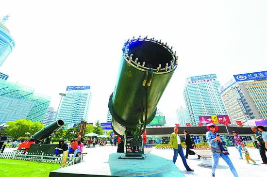 5月5日,甘肃兰州东方红广场,两台军绿色炮筒式的机器引得民众围观。这两台机器为高射远程风送式喷雾机,可将自来水雾化后喷出,射程达600米。兰州轨道交通1号线东方红广场站施工期间,该设备将被用来浇灌广场草坪,是治理广场雾霾的利器。裴强/CFP