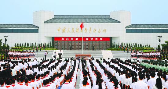 卢沟桥畔,坐落在这里的中国人民抗日战争纪念馆雄伟庄严。纪念馆前广场上,鲜艳的五星红旗高高飘扬。纪念馆正门上方悬挂着“勿忘国耻 圆梦中华”的巨幅标语。