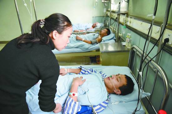 1月3日,在哈尔滨医科大学附属第一医院门诊部监护室里,受伤消防队员张宇的姐姐在床边陪护。目前,哈尔滨仓库火灾中受伤的14名伤员在该院接受专家的全力救治。