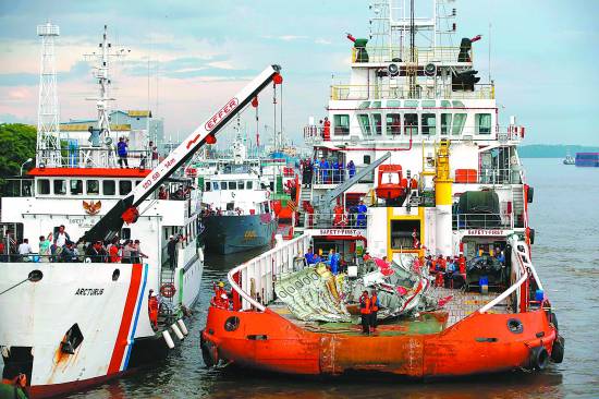 1月11日,运送失事亚航客机机尾残骸的搜救船只抵达印尼庞卡兰布翁附近的库迈港。