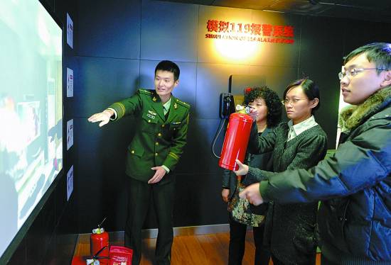 1月15日,一位居民在互动学习家庭火灾扑救常识。当日,山东首个社区安全智能体验馆在青岛金岭社区落成。这个体验馆由青岛中韩边防派出所自主研发设计,设有模拟家庭火灾隐患排查、酒后驾驶模拟、新型网络诈骗预防等8个仿真系统,综合运用情景模拟、互动体验等先进技术,让参观者在真实场景中掌握与日常生活息息相关的安全技能,增强安全意识。