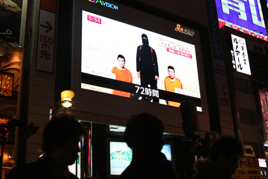 1月23日,在日本东京,一块显示屏播放有关遭绑架的日本人质的新闻。一名日本政府高级官员1月24日说,极端组织“伊斯兰国”杀害一名日本人质的行为是“无法接受”的。 新华社/美联