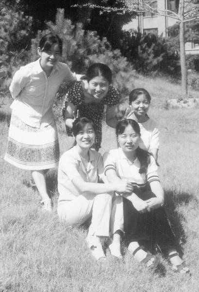 1999年,离开大学校园前,同宿舍的五朵金花在主楼前的草坪上留影。
