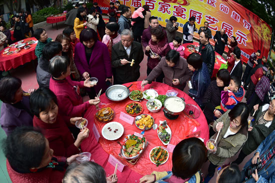 3月1日,福建省泉州市丰泽新村小区广场,丰泽社区举办邻里节百家宴厨艺展示活动,吸引了众多居民参与。现场22张圆桌依序摆开,场面热闹,各桌展示了居民自己制作的各种风味的菜肴。大家在交流厨艺的同时,增进了邻里关系。CFP供图
