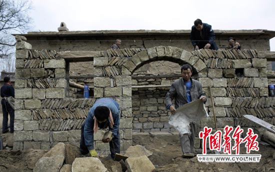 4月3日,陕西省延川县文安驿镇,人们正在古驿站内修葺施工。当地正在打造一个复合型旅游项目,力图呈现一个集驿站、窑居、知青记忆、路遥人生为一体的文化旅游名镇。