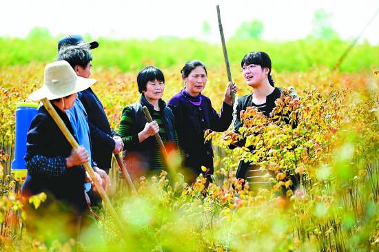 4月14日,孔维玲在苗木基地里教村民们苗木栽培技术。